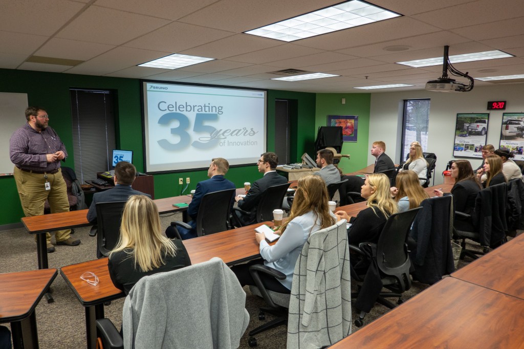 Bruno is an amazing company because they empower individuals with mobility issues to regain and maintain their independence by offering stair lifts, vertical platform lifts, and scooter and powerchair lifts for vehicles. Our time at Bruno began with a presentation about the family-run company’s 35-year history, its product lines, the industry, and manufacturing. Bill Belson, the Director of Engineering, was very knowledgeable about the intricacies of the products and processes.