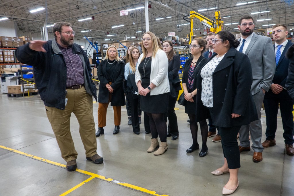 After the presentation, we donned our safety glasses so that Bill and Steve, another employee, could show us the manufacturing facility. Bill also discussed lean manufacturing, including the utilization of the kanban scheduling system. Bruno often partners with vehicle manufactures to determine how to best tweak their products to work well with the car dimensions. It was through one of these partnerships with Toyota that those lean techniques were implemented to increase efficiency. Utilizing the Just in Time (JIT) inventory system, color-coded kanban cards, and streamlined processes, orders are manufactured, tested, packed and shipped very quickly. In fact, Bruno has an inventory turnover every 2 weeks, with 85% of orders shipped in just 48 hours!