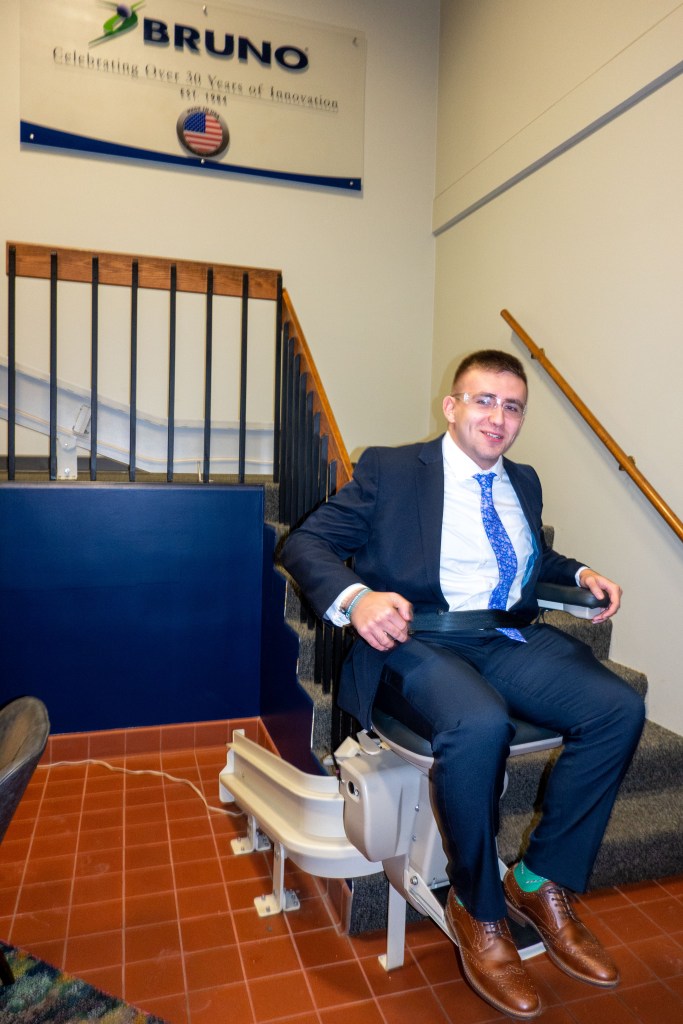 I learned that Bruno pioneered the battery-powered stair lifts in the industry. This made bulky power cords unnecessary, effectively decreasing the associated fire hazard. Bruno offers both a standard straight rail stair lift and a custom curved rail lift so that it can mold to any angles required. Photogrammetry is used to ensure the correct measurements of customers’ homes are recorded. Many photos or a particular stairway are taken from many different angels, then those are combined to create a digital 3D structure. It was very cool to see a steel blank as it was run through rollers to form the exact curve a specific order required when we were in the facilities.